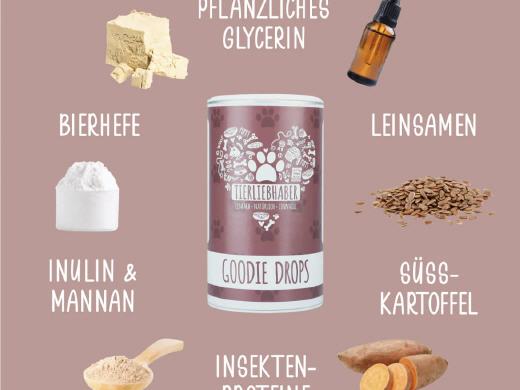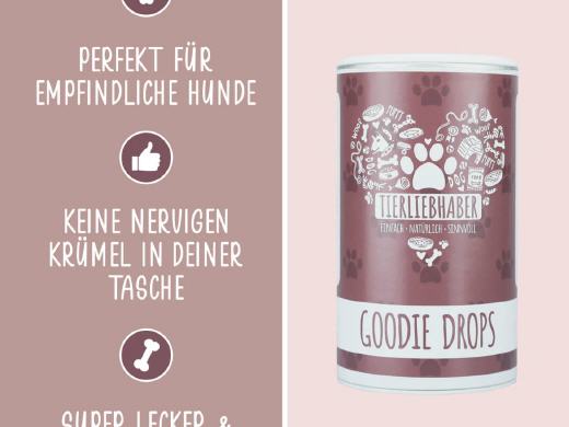Die Goodie Drops sind eine kaltgepresste, getreidefreie und vor allem gesunde Belohnung, die deinen Hund zeitgleich mit wertvollem Insektenprotein aus Hermetia Larven und erlesenen Omega-3-Fettsäuren aus antarktischem Krill versorgen. Dank der weichen Konsistenz, der kleinen Größe und dem leckeren Geschmack eignen sich die Trainings-Drops hervorragend für das Hundetraining oder den Hundesport. Zudem bleiben deine Taschen immer sauber, da die Drops nicht krümeln oder fetten.
