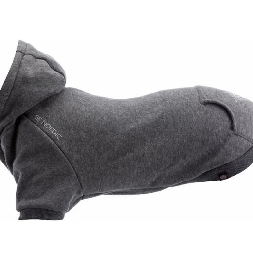 Modischer Sweater-Hoodie mit Klettverschluss im Bauchbereich und Druckknopf zum Fixieren der Kapuze. Ein wärmender Hundepullover mit aufgerauhter, weicher Innenseite.