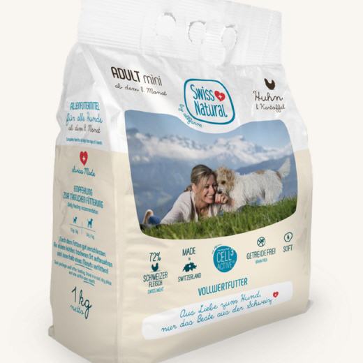 Swiss Natural Soft mini Huhn und Kartoffel ist sehr beliebt bei kleinen Hunden und wird auch oft im Training eingesetzt. Swiss Natural Soft Adult mini ist eine hochwertige getreidefreie Vollnahrung mit 72% Hühnerfleisch aus der Schweiz. Durch unser schonendes Herstellungsverfahren SOFT bleibt in den Futterbrocken bis zu 30% Restfeuchte enthalten. Mit dem Monoprotein und ImmunoCell3aktive steht dieses Futter für eine optimale Verträglichkeit.