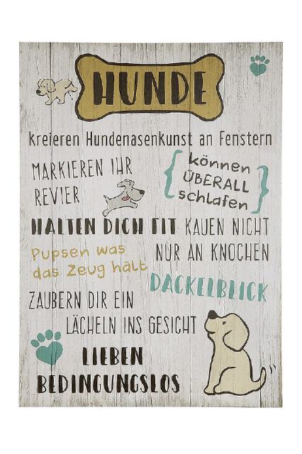 Weisheit "Hunde" braun/blau "... kreieren Hundenasenkunst an Fenstern - markieren ihr Revier - können überall schlafen - halten dich fit - kauen nicht nur an Knochen - pupsen was das Zeug hält - zaubern dir ein Lächeln ins Gesicht - Dackelblick - lieben bedingungslos"