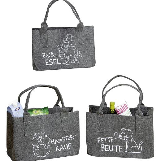 Praktische Einkaufstasche aus Filz mit lustigen Sprüchen.